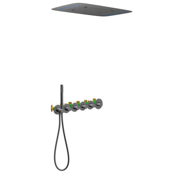"Черное золото" неизменно эффектный и привлекающий внимание цвет. Приглушенный мягкий оттенок черного, подчеркивает форму раковины или цвет мебели.Встраиваемая душевая система с термостатом Timo Saona 2319 относится к премиальному сегменту, предназначена для монтажа в полой или твердой стене. Термостатический картридж поддерживает стабильную температуру воды, обеспечивая максимально комфортные условия для принятия водных процедур. Встроенный потолочный душ большого размера создает имитацию проливного дождя, вода обливает человека целиком. Регулируя напор воды можно получить массажное воздействие, что очень полезно для здоровья. Основные преимущества встроенной системы: элегантный внешний вид, все коммуникации и крепления спрятаны в стену и потолок, снаружи видны только декоративные элементы. Установить встроенную систему можно в любом месте. Сложностей монтажа не возникает при установке элементов душевой системы опытным сантехником. Внимательно изучите инструкцию по монтажу и эксплуатации. Цвет "черное золото" не капризен в уходе, на нем менее заметны загрязнения и мелкие царапины.