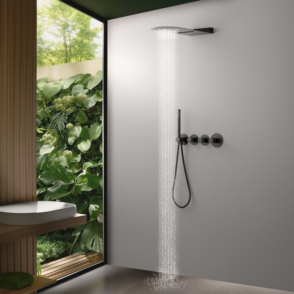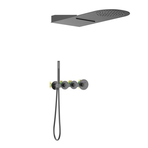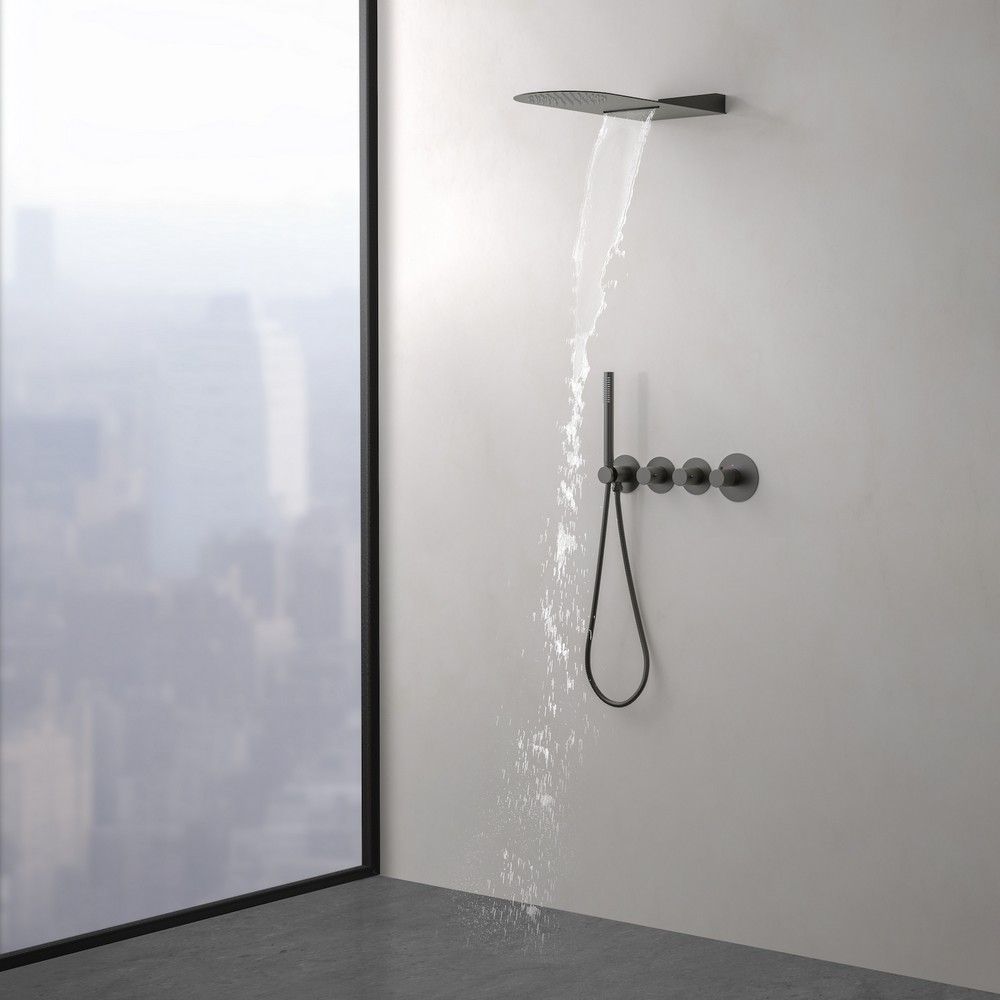 "Черное золото" неизменно эффектный и привлекающий внимание цвет. Приглушенный мягкий оттенок черного, подчеркивает форму раковины или цвет мебели.Душевая система с термостатом Timo Saona 2350 относится к премиальному сегменту, предназначена для монтажа в полой или твердой стене. Термостатический картридж поддерживает стабильную температуру воды, обеспечивая максимально комфортные условия для принятия водных процедур. Настенный душ с двумя режимами позволяет принимать водные процедуры в зависимости от настроения. Регулируя напор воды можно получить массажное воздействие различной интенсивности. Используя режим "каскад"- получают седативное (успокаивающее) воздействие на затылочную часть головы или шейный отдел. Основные преимущества встроенной системы: элегантный внешний вид, все коммуникации и крепления спрятаны в стену, снаружи видны только декоративные элементы. Установить встроенную систему можно в любом месте. Использовать такой смеситель очень удобно, регулировка температуры воды осуществляется ручкой термостата (расположена справа). Переключение режимов "каскад", "тропический душ", "ручной душ" и увеличение напора осуществляется поворотом ручек диверторов расположенных слева от термостата. В положении ручек диверторов в положение 12:00 (смеситель выключен). Смеситель может работать в нескольких режимах одновременно"каскад"+"ручной душ", "тропический душ"+"ручной душ". Сложностей монтажа не возникает при установке элементов душевой системы опытным сантехником. Внимательно изучите инструкцию по монтажу и эксплуатации. Цвет "черное золото" не капризен в уходе, на нем менее заметны загрязнения и мелкие царапины.