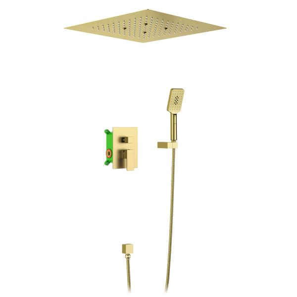 Цвет "матовое золото" никогда не выйдет из моды, во все времена драгоценный металл был признаком богатства.Встраиваемая душевая система Selene 2029, относится к премиальному сегменту, предназначена для монтажа в полой или твердой стене. Встроенный потолочный душ большого размера создает имитацию проливного дождя, вода обливает человека целиком. Регулируя напор воды можно получить массажное воздействие, что очень полезно для здоровья. Основные преимущества встроенной системы: элегантный внешний вид, все коммуникации и крепления спрятаны в стену и потолок, снаружи видны только декоративные элементы. Установить встроенную систему можно в любом месте. Использовать такой смеситель очень удобно, регулировка напора и температуры воды осуществляется одним рычагом. Переключение режимов "тропический душ" и "ручной душ" осуществляется поворотом ручки дивертора. Сложностей монтажа не возникает при установке элементов душевой системы опытным сантехником.