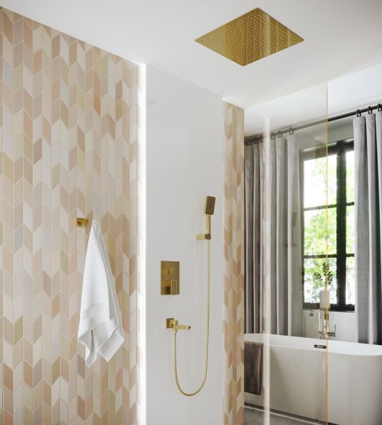 Цвет "матовое золото" никогда не выйдет из моды, во все времена драгоценный металл был признаком богатства.Встраиваемая душевая система Selene 2039, относится к премиальному сегменту, предназначена для монтажа в полой или твердой стене. Встроенный потолочный душ большого размера создает имитацию проливного дождя, вода обливает человека целиком. Регулируя напор воды можно получить массажное воздействие, что очень полезно для здоровья. Основные преимущества встроенной системы: элегантный внешний вид, все коммуникации и крепления спрятаны в стену и потолок, снаружи видны только декоративные элементы. Установить встроенную систему можно в любом месте. Использовать такой смеситель очень удобно, регулировка напора и температуры воды осуществляется одним рычагом. Переключение режимов "тропический душ" и "излив" осуществляется поворотом ручки дивертора. Для переключения потока воды с излива на ручную лейку нужно повернуть излив к стене. Сложностей монтажа не возникает при установке элементов душевой системы опытным сантехником. Внимательно изучите инструкцию по монтажу и эксплуатации.
