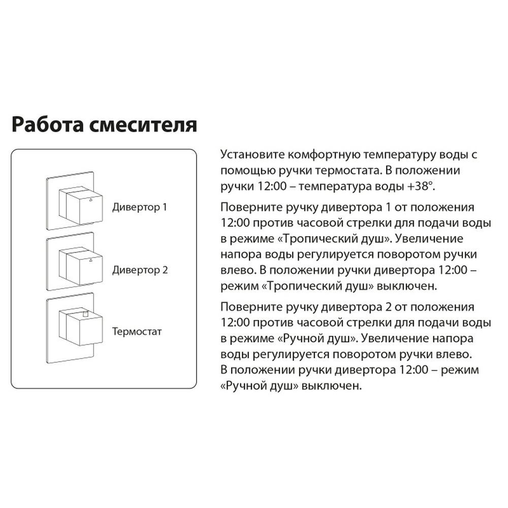 Цвет "матовое золото" никогда не выйдет из моды, во все времена драгоценный металл был признаком богатства.Душевая система с термостатом Selene 2229 относится к премиальному сегменту, предназначена для монтажа в полой или твердой стене. Верхний душ с вертикальным потолочным креплением выполнен из латуни. Термостатический картридж поддерживает стабильную температуру воды, обеспечивая максимально комфортные условия для принятия водных процедур. Регулируя напор воды в режиме "тропический душ" можно получить массажное воздействие различной интенсивности. Основные преимущества встроенной системы: элегантный внешний вид, все коммуникации и крепления спрятаны в стену, снаружи видны только декоративные элементы. Установить встроенную систему можно в любом месте. Использовать такой смеситель очень удобно, стильная стойка из латуни позволяет установить ручную лейку-карандаш на необходимую высоту. Регулировка температуры воды осуществляется ручкой термостата (расположена снизу). Включение режима "тропический душ" и регулировка напора осуществляется поворотом ручки дивертора (расположена сверху) влево. В положении ручки дивертора 12:00 режим "тропический душ" выключен. Для переключения в режим "ручной душ" поверните ручку дивертора (расположена по центру) от 12:00 против часовой стрелки. Увеличение напора воды регулируется поворотом ручки влево. В положении ручки 12:00 режим "ручной душ" выключен. Сложностей монтажа не возникает при установке элементов душевой системы опытным сантехником. Внимательно изучите инструкцию по монтажу и эксплуатации.