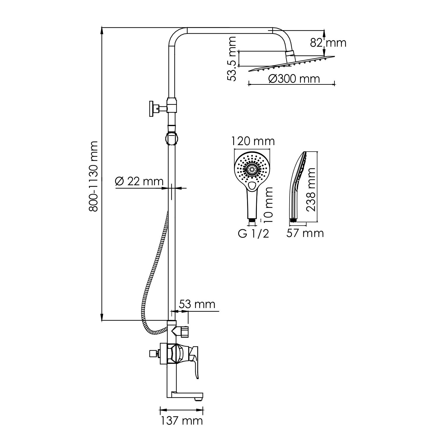 Стойка для душа, Ø 22 мм регулируемая по высоте
