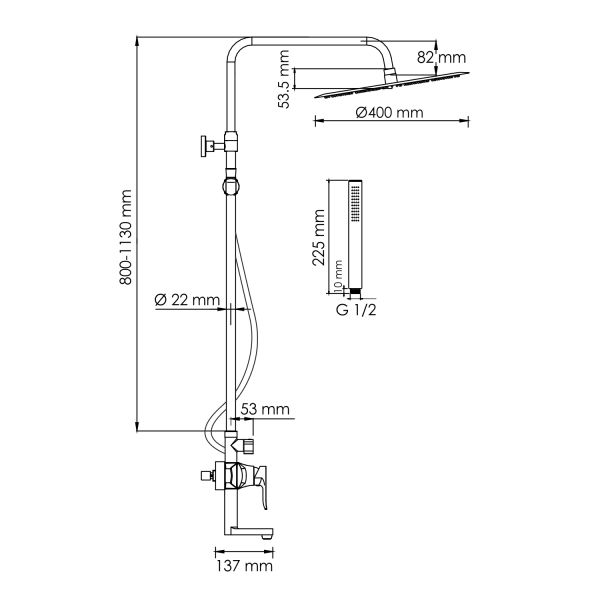 Душевая насадка производится из нержавеющей стали. Форсунки из силикона с системой защиты от известковых отложений. Насадки крепятся к штанге при помощи шарнирного соединителя, внутрь которого встроен сетчатый аэратор для равномерного распределения воды. Также шарнирный соединитель позволяет менять угол наклона душевой насадки от 0 до 22 градусов.Держатель лейки