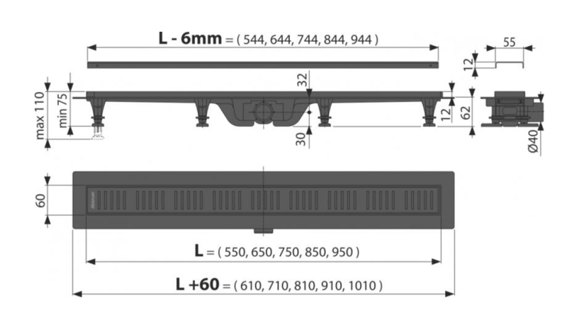 Душевой лоток AlcaPlast с порогами для перфорированной решетки 55см черный матовый APZ10BLACK-550M