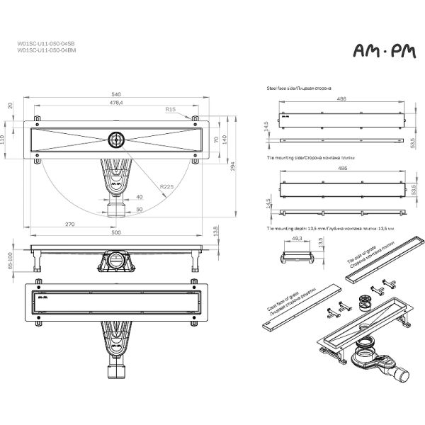 Душевой лоток AM.PM MasterFlow 50 W01SC-U11-050-04BM с Черной матовой решеткой / под плитку Tile