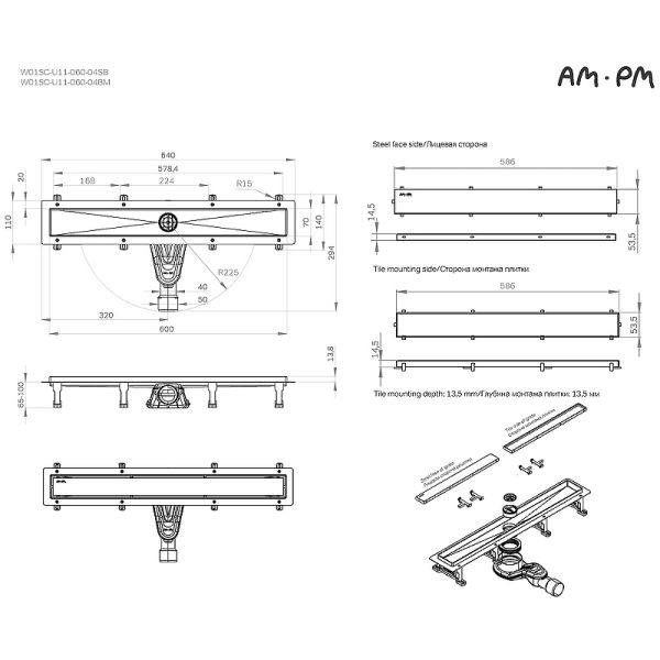 Душевой лоток AM.PM MasterFlow 60 W01SC-U11-060-04SB с решеткой Хром матовый / под плитку Tile