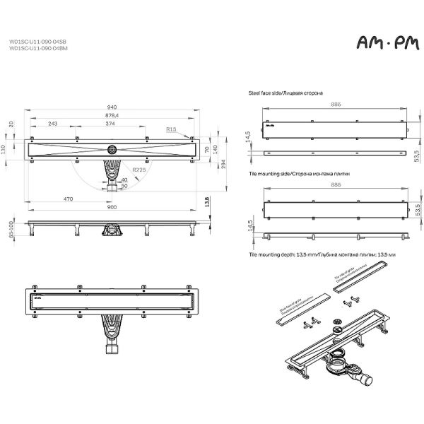 Душевой лоток AM.PM MasterFlow 90 W01SC-U11-090-04BM.Детально проработанная форма изделия, точные выверенные линии. Представляем инновационный лоток для душа Masterflow.Универсальная двухсторонняя решетка лотка может быть использована как самостоятельная декоративная вставка, либо как база для вклейки плитки.Лоток для душа имеет высокую пропускную способность 50 л/мин. Обладает комбинированным затвором: сухим магнитным и гидрозатвором. Проверенная технология гарантирует 100% защиту от проникновения запахов из канализации, высокую надежность и долговечность. Выдерживает даже самые большие механические нагрузки. Поворотный сифон на 360 градусов позволяет установить лоток наиболее удобным и комфортным образом.Продукт обладает низкой высотой монтажа и возможностью регулировки, что предполагает экономию бюджета при заливке пола. Нержавеющая сталь со специальным антикоррозийным защитным покрытием, нанесенная методом кислотной пассивации. Выход разработан на два диаметра: 40 и 50 мм, которые выбираются в процессе монтажа.Характеристики:Цвет решетки: черный матовый.