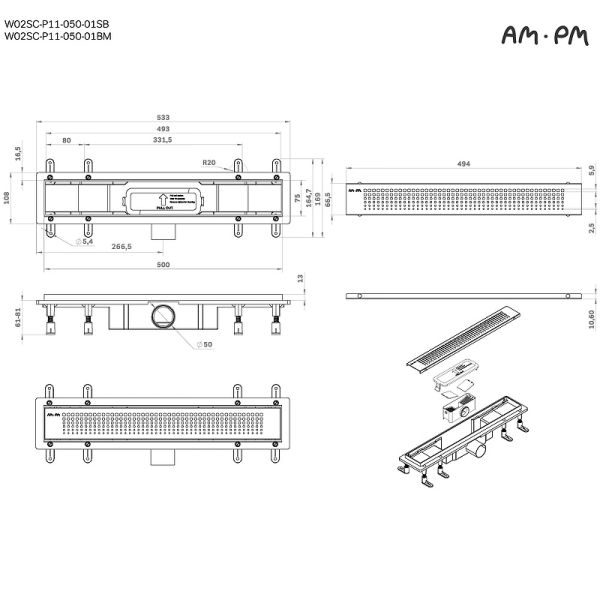 Душевой лоток AM.PM PrimeFlow 50 W02SC-P11-050-01SB с решеткой Хром матовый Cut Gradient