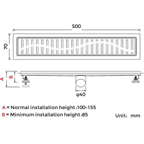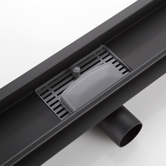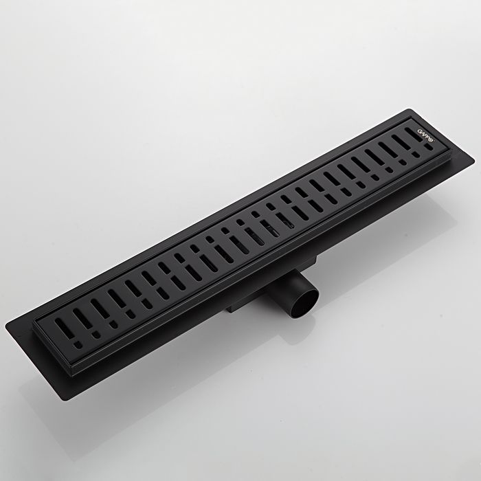 Душевой линейный трап черного цвета Gappo G85007-36, длина 50 см, ширина 7 см, минимальная монтажная высота 85 мм, изготовлен трап из нержавеющей стали, боковой выпуск 40 мм, в комплекте переходник на 50 мм. Защита от запаха: комбинированный гидрозатвор, защита от проникновения запаха и жидкости из канализации.