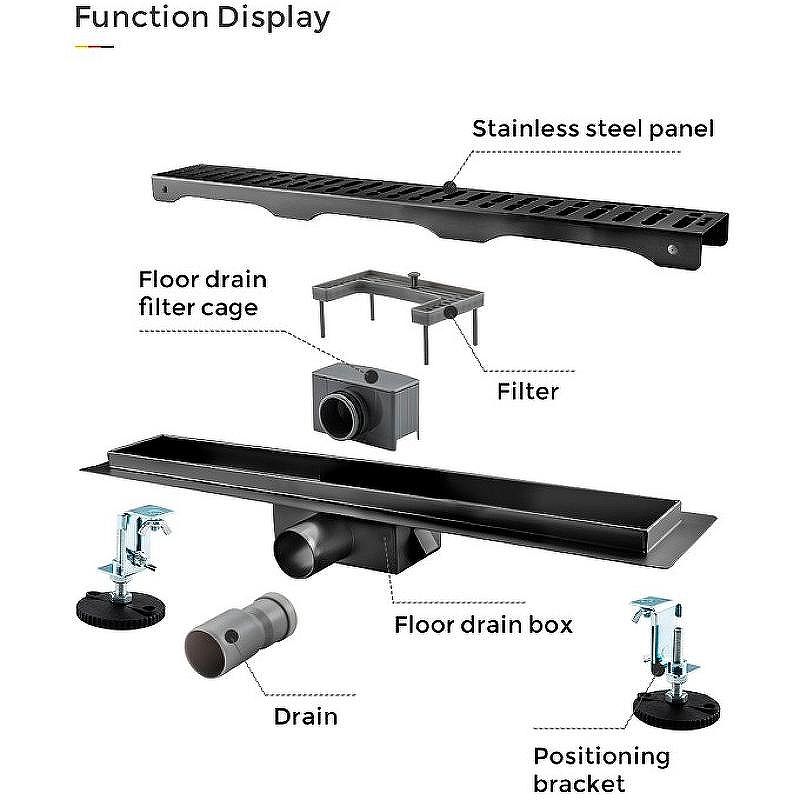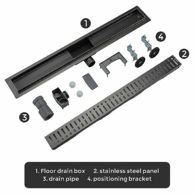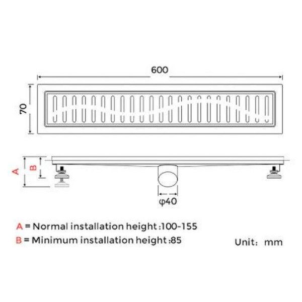 Душевой трап линейного типа Gappo G86007-39, длина 60 см, цвет оружейная сталь, изготовлен трап из нержавеющей стали. Минимальная монтажная высота 85 мм, боковой выпуск 40 мм, в комплекте переходник на 50 мм. Защита от запаха: комбинированный гидрозатвор, защита от проникновения запаха и жидкости из канализации.