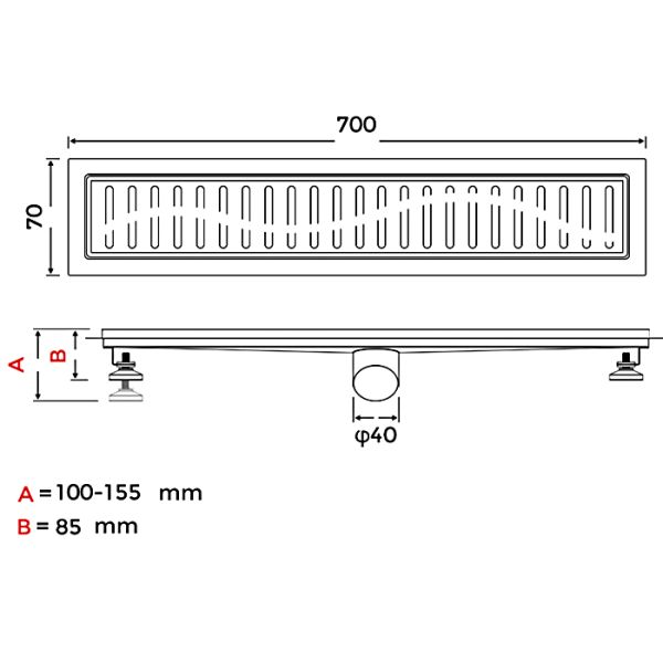 Душевой трап Gappo G87007-3, длина 70 см, цвет сатин, изготовлен трап из нержавеющей стали. Минимальная монтажная высота 85 мм, боковой выпуск 40 мм, в комплекте переходник на 50 мм. Защита от запаха: комбинированный гидрозатвор, защита от проникновения запаха и жидкости из канализации.
