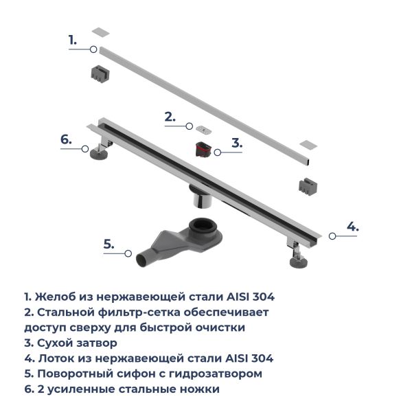 Принимающей декоративный жёлоб маскирует сливное устройство, образует щель, куда сливается вся вода из душевого пространства. Для того чтобы вода эффективно отводилась в трап, на этапе монтажа необходимо обеспечить уклон облицовочной плитки в сторону принимающего жёлоба.Для доступа к технической части устройства с целью очистки необходимо извлечь среднюю часть жёлоба вместе с боковыми декоративными заглушками.Лоток выполнен из нержавеющей стали толщиной 2 мм, собирает стекающую воду и за счёт технического уклона отводит её в сетку-фильтр, которая задерживает волосы и мелкий мусор.Далее вода проходит в сифон с комбинированным затвором, Первая вода сталкивается с сухим затвором, который изготовлен из высокопрочного ABS-пластика. Затвор выполнен в виде крышки с силиконовой прокладкой, крышка открывается под давлением воды и плотно притягивается при отсутствии воды за счёт пружинного механизма, обеспечивая 100% защиту от проникновения неприятных запахов в ванную комнату из канализации.После вода проходит через сифон с гидрозатвором и сливается в канализацию.Сифон с гидрозатвором присоединяется к нижней части лотка трапа и имеет боковой отвод с поворотом на 360 градусов, что позволяет подключить канализационный сток с любой стороны.