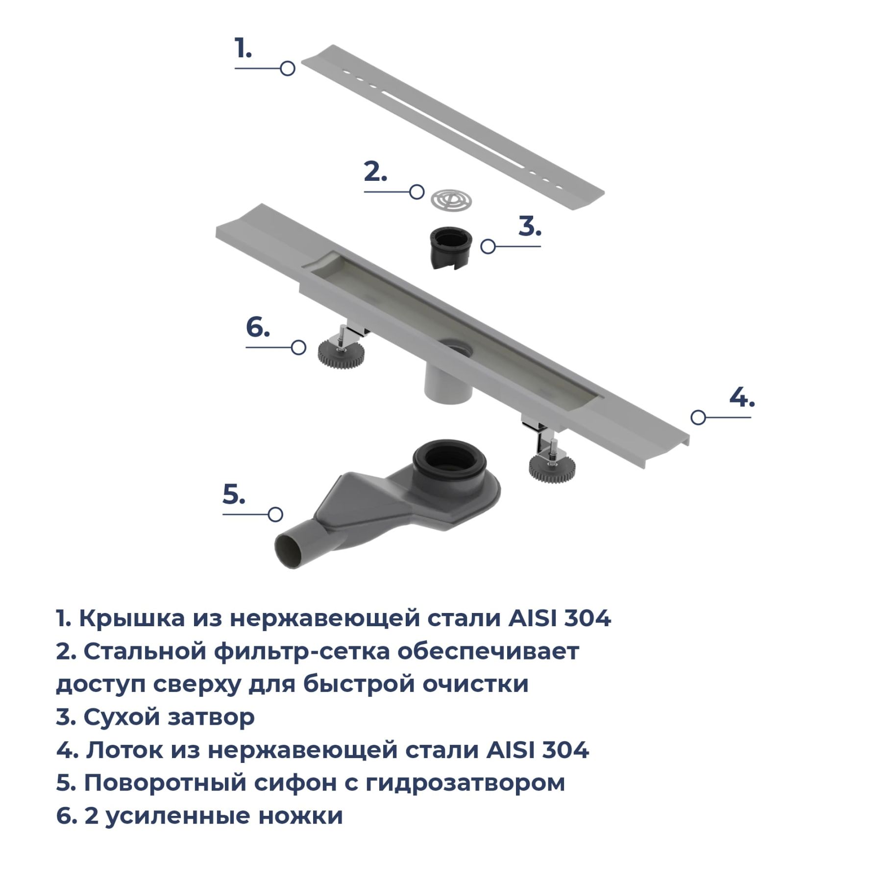 - Две усиленные опоры из нержавеющей стали с регулировкой высоты