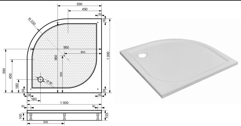 Для малогабаритных санузлов мы разработали угловые душевые поддоны. Поддон Омега имеет форму четверти круга. Бортики с внутренней стороны напоминают форму листочка.