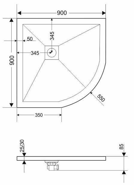 - Размеры поддона: четверть круга 90 x 90 толщина 2,5 см