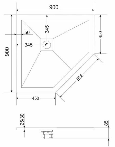 - Размеры поддона: пятиугольный 90 x 90 толщина 2,5 см