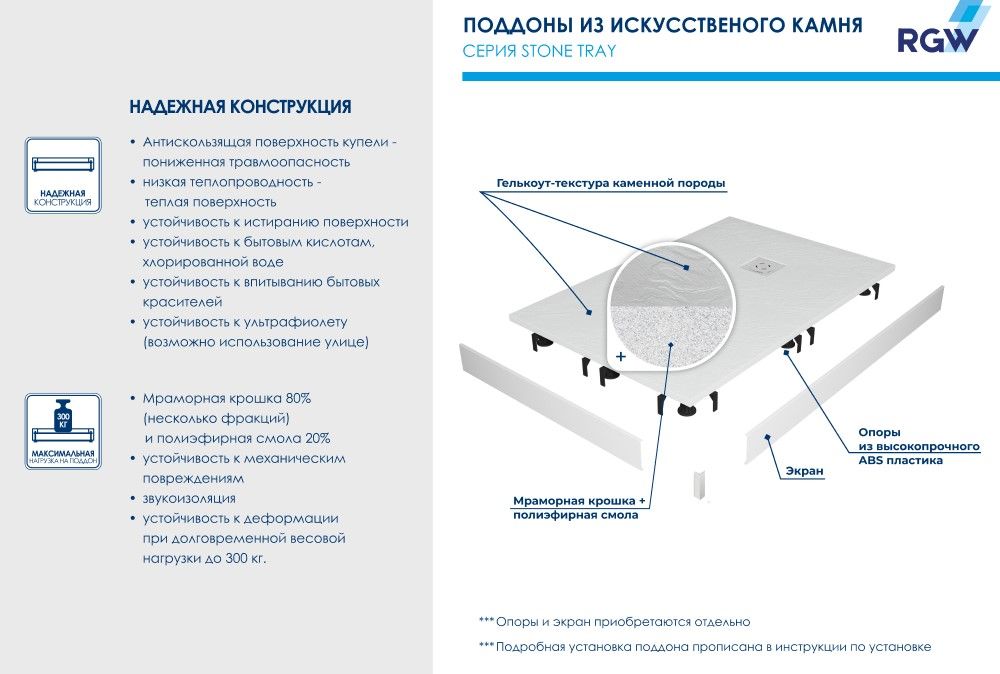 Душевые поддоны RGW ST с фактурой под сланцевый камень.Меняем представление о текстуре «искусственный камень»!В серии душевых поддонов Stone Tray появилась новинка прямоугольной формы в роскошном белом цвете и невероятно широком размерном ряду. Если ваш проект совершенно уникален и не вписывается в готовые форматы, мы предложим сделать подгонку по индивидуальному размеру.Визуальные акценты и форма поддона - новые, а качество прежнее: рельефная антискользящая поверхность в сочетании с низкой теплопроводностью материала создает ощущение нагретого солнцем камня под вашими ступнями и выводит обычный прием душа на новый уровень комфорта.Высокотехнологичный материал - 80% мраморной крошки плюс полиэфирные смолы - обеспечивает беспрецедентную устойчивость к механическим, химическим и другим видам повреждений, а также выдерживает долговременную весовую нагрузку до 300 кг.Добавьте сюда низкий уровень шума воды, когда вы принимаете душ для ещё большего удовольствия.Новый поддон — это самостоятельный аксессуар вашей душевой. Универсальный цвет, откликающийся на уровень освещения, и текстура “под камень” идеально сочетаются с интерьерами от смелых лофт и хайтек до романтичного прованса, а решетка из нержавеющей стали, защищающая слив, создаст безупречный аккомпанемент душевым системам, а таком же оттенке.Обратите внимание: фактические размеры с учетом заполнения швов могут меняться в пределах -8/+2 мм.По вашему желанию можем установить поддон на ножки: