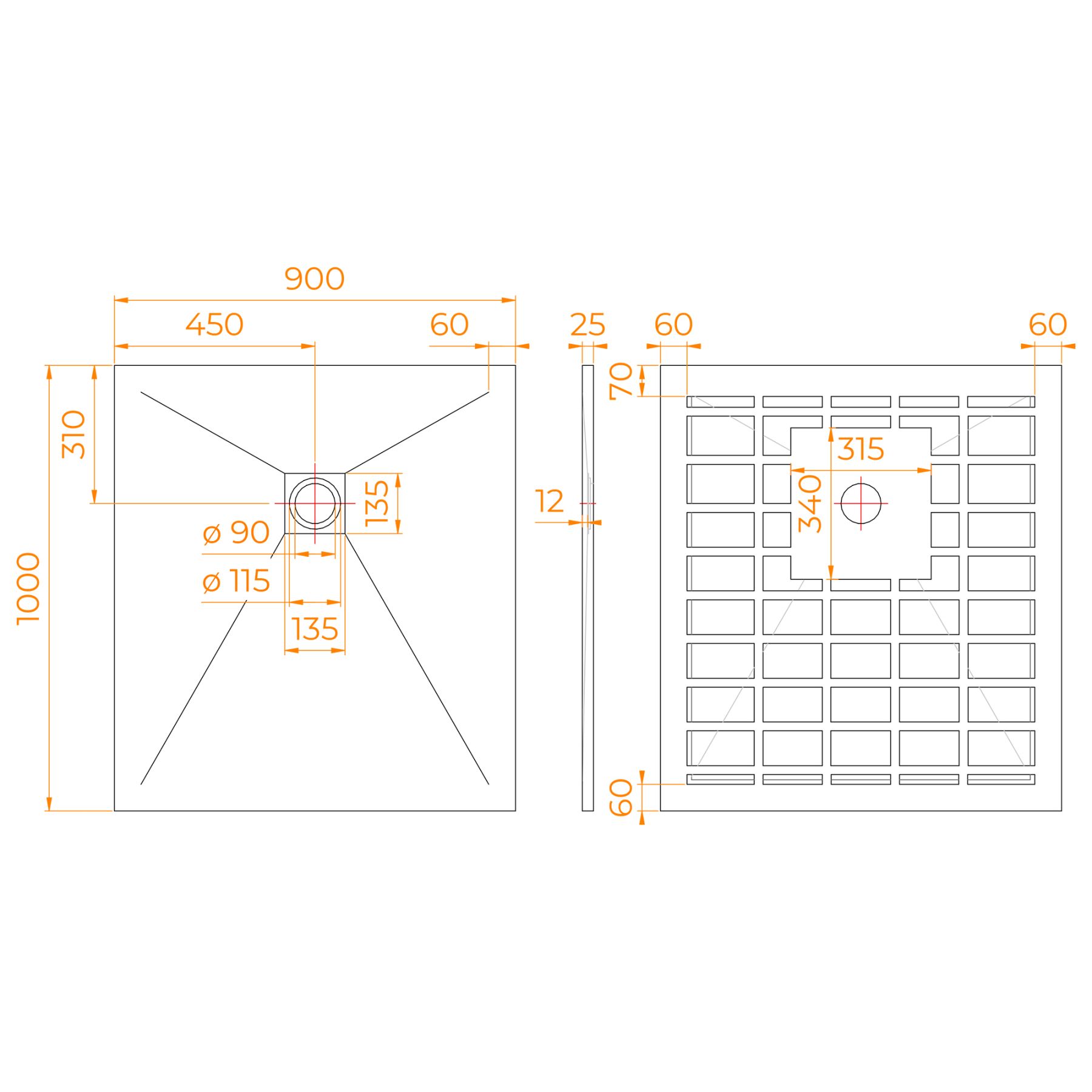 - Широкий размерный ряд: от 800x800 мм с шагом в 10 см до максимального размера 900x1200 мм, что дает возможность подобрать оптимальный поддон для вашей ванной комнаты.