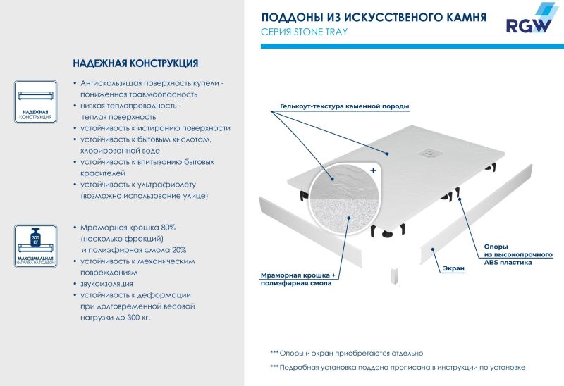 Душевые поддоны RGW ST с фактурой под сланцевый каменьДля смелых любителей экстравагантных решений в интерьере!В серии душевых поддонов Stone Tray появилась новинка редкой полукруглой формы в сумасшедшем терракотовом цвете! Форма полукруга - идеальное решение для компактной ванной комнаты и позволит по максимум использовать полезное пространство, например, для мебели или бытовой техники.Изделие представлено в размере 900х900, при необходимости мы можем сделать резку по индивидуальному размеру.Визуальные акценты и форма - новые, а качество прежнее: рельефная антискользящая поверхность в сочетании с низкой теплопроводностью материала создает ощущение нагретого солнцем камня под вашими ступнями.Высокотехнологичный материал - 80% мраморной крошки плюс полиэфирные смолы - обеспечивает беспрецедентную устойчивость к механическим, химическим и другим видам повреждений, а также выдерживает долговременную весовую нагрузку до 300 кг.Приятное дополнение: низкий уровень шума воды, когда вы принимаете душ для ещё большего удовольствия.Новый поддон — это самостоятельный аксессуар вашей душевой. Самостоятельный и акцентный цвет и текстура “под камень” идеально сочетаются с интерьерами от смелых лофт и хайтек до романтичного прованса, а решетка из нержавеющей стали, защищающая слив, создаст безупречный аккомпанемент душевым системам, а таком же оттенке.Обратите внимание: фактические размеры с учетом заполнения швов могут меняться в пределах -8/+2 мм.По вашему желанию можем установить поддон на ножки: