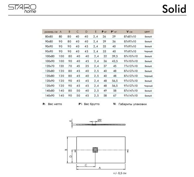 Душевой поддон Starohome Solid 120х80, литьевой мрамор, прямоугольный, цвет черный матовыйДушевой поддон Solid изготовлен из литиевого мрамора Sanydur® и представляет собой монолитный материал на 85% состоящий из мраморной крошки, минеральных пигментов и связывающего материала в виде полиэфирной смолы. Сверху материал покрывается гелевым слоем Gel Coat. Покрытие Gel Coat - это прочный прозрачный, абсолютно непористый материал, защищающий материал поддона от загрязнений, перепада температур и УФ-излучения. Душевые поддоны Solid производятся на современном европейском оборудовании для европейского рынка. Контроль качества осуществляется на всех этапах производства.