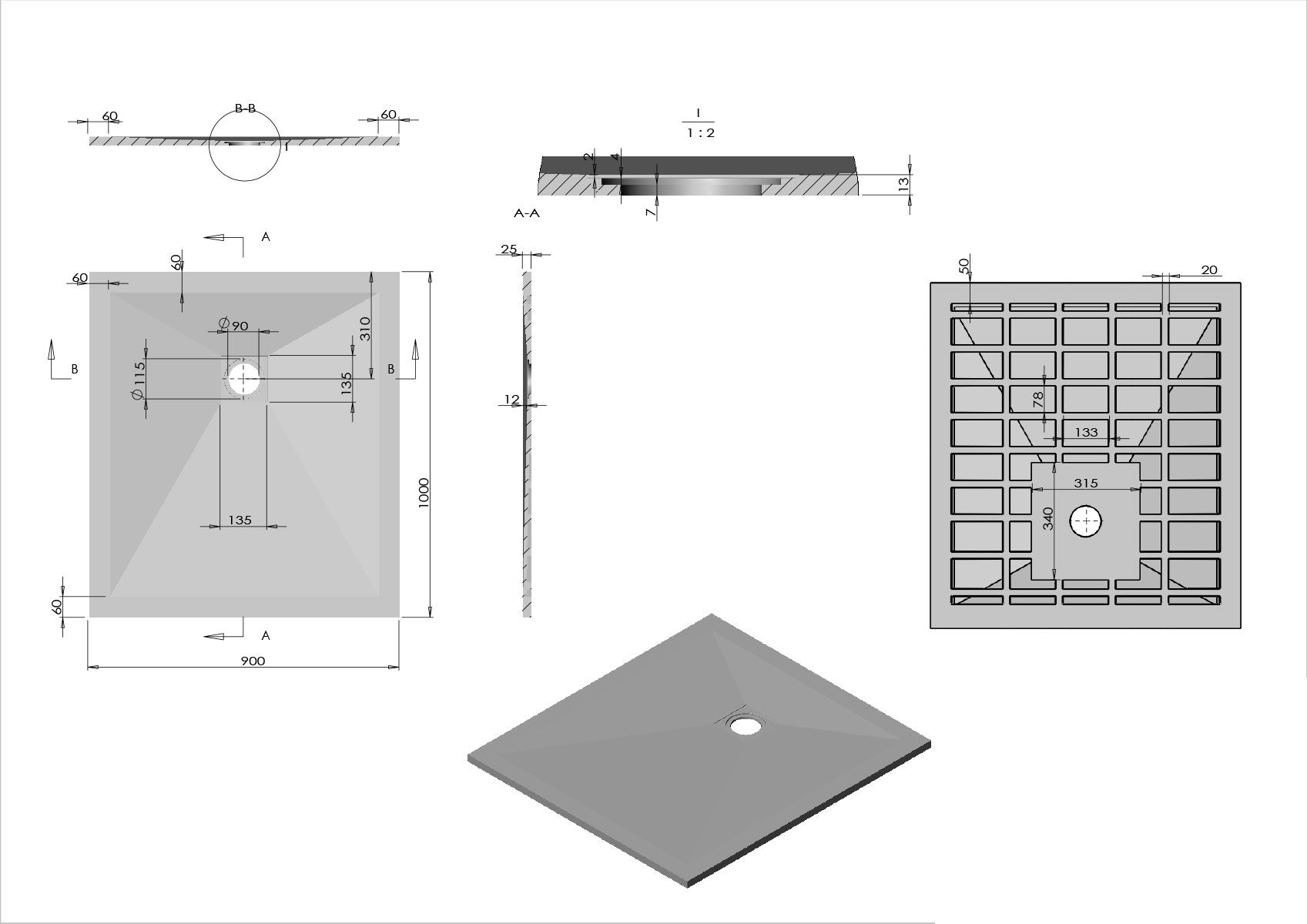 1000×900Поддон комплектуется сифоном с гидрозатвором – VSPH-D132, квадратная крышка из нержавеющей стали