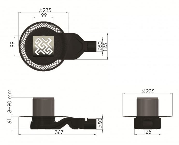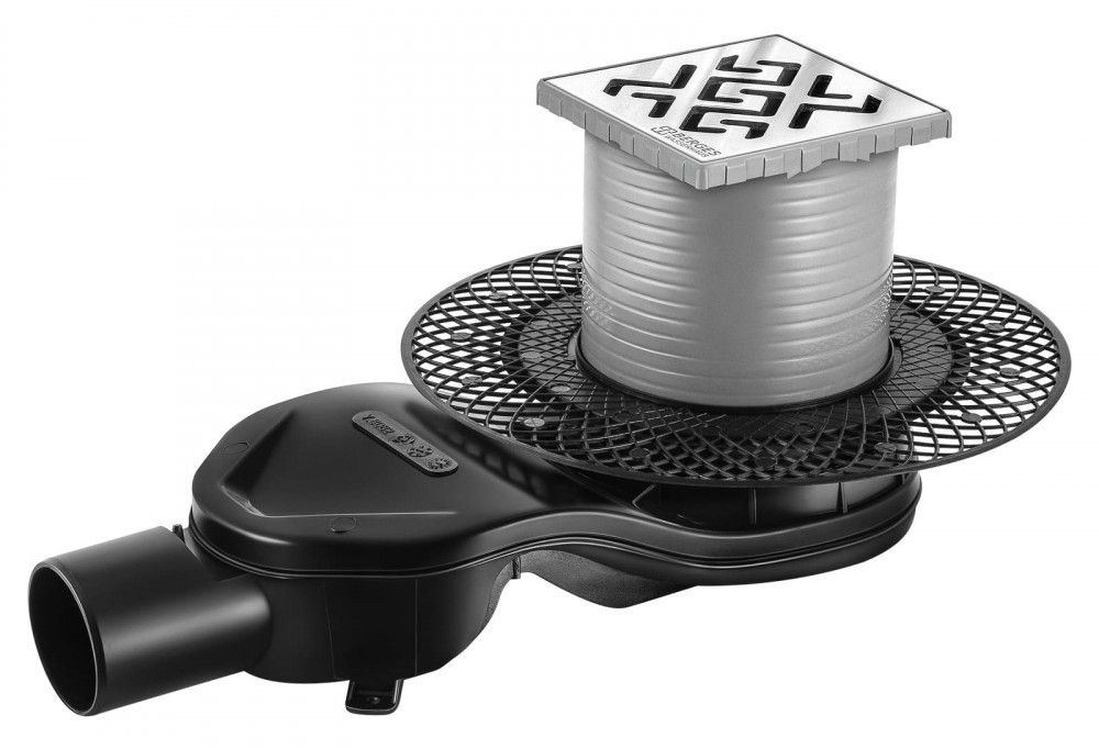 Решетка толщина 3мм, нержавеющая сталь AISI 304Горловина трапа, пластикФланец трапа с переходником, РРМонтажная заглушка, PPСамопромывной S-образный сифон PPГоризонтальный выпуск D50 H60, пропускная способность 42л/мин, монтаж 360°Монтажный ключ, пластик