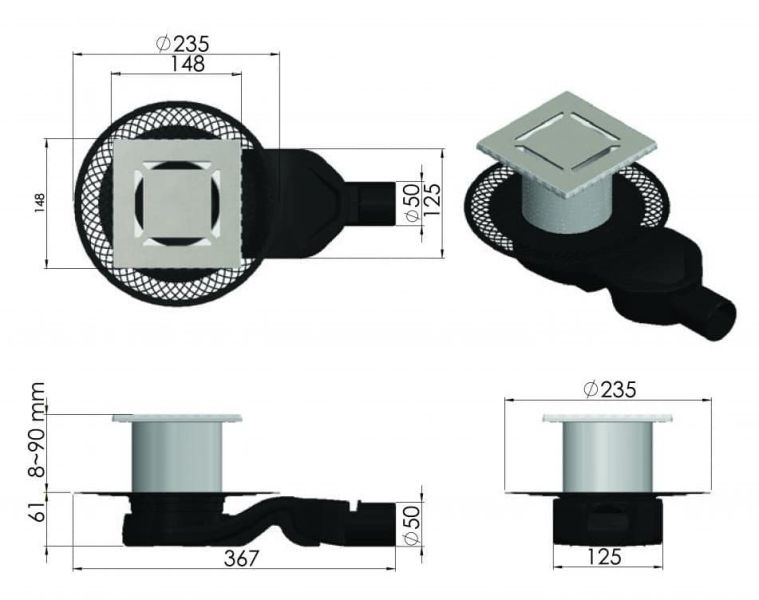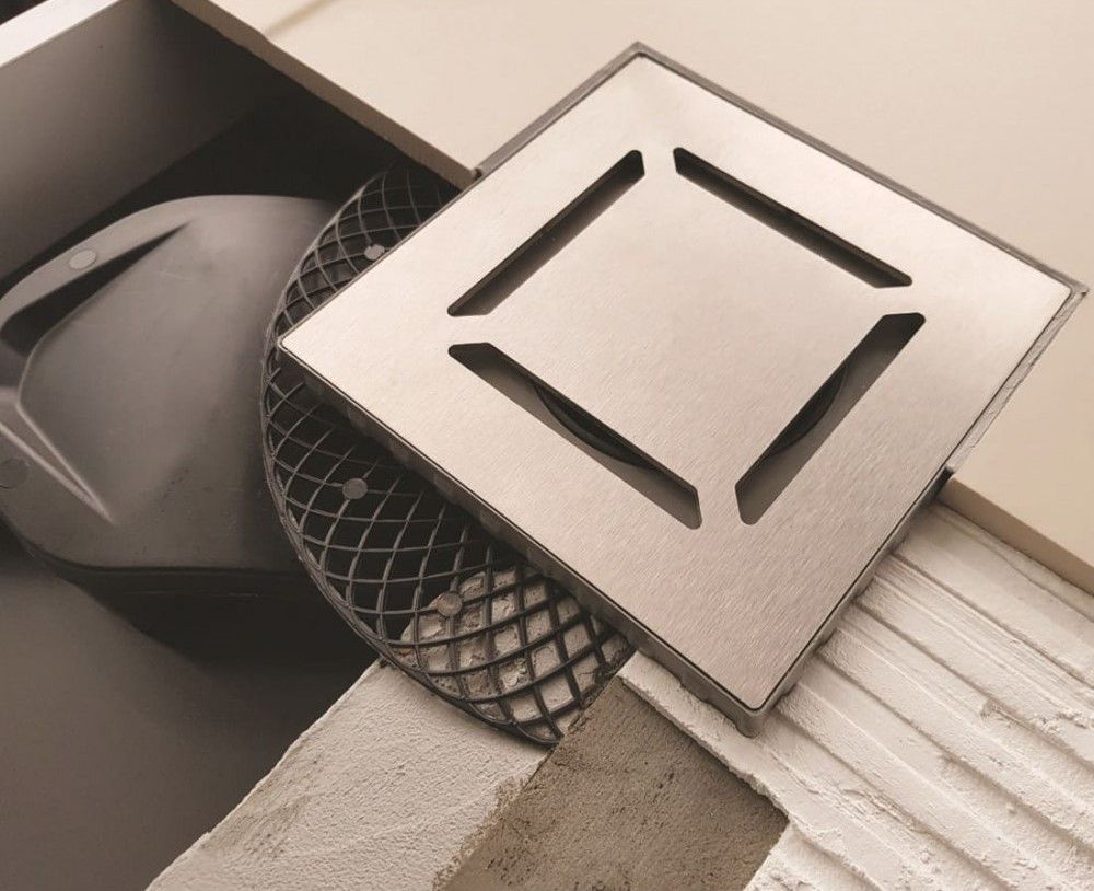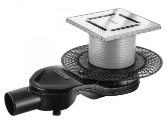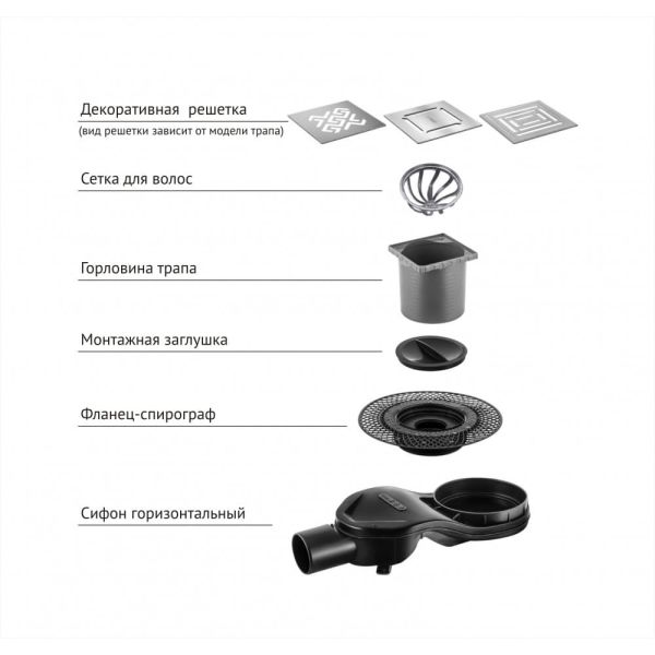 Решетка толщина 3мм, нержавеющая сталь AISI 304Горловина трапа, пластикФланец трапа с переходником, РРМонтажная заглушка, PPСамопромывной S-образный сифон PPГоризонтальный выпуск D50 H60, пропускная способность 42л/мин, монтаж 360°Монтажный ключ, пластик