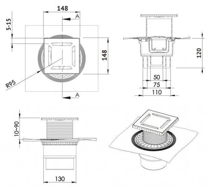 Решетка толщина 3мм, нержавеющая сталь AISI 304Горловина трапа и эксцентрик, пластикМонтажная заглушка, PPСифон PP с гидроизоляциейВертикальный выпуск D50/75/110, монтаж 360°Комбинированный затворФланец с 3 сторон загибается на 90°Монтажный ключ, пластик