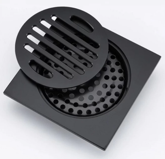 Душевой трап квадратный с горизонтальным выпуском Gappo G81053-6, размер 10 * 10 см, цвет черный. Изготовлен трап из латуни, боковой выпуск 50 мм