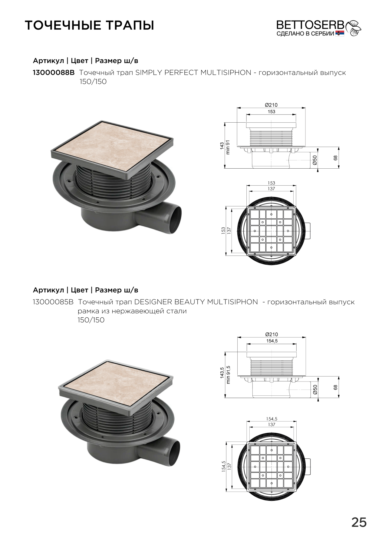 Трап Bettoserb 15x15 SIMPLY PERFECT MULTISIPHON Душевой трап с комбинированным затвором – эффективный отвод воды без запахов Этот душевой трап с комбинированным затвором (сухим + гидрозатвором) предназначен для быстрого и надежного отвода воды с пола в душевых кабинах, влажных зонах и помещениях с плиточным покрытием. Низкая монтажная высота (62 мм) упрощает установку, а пропускная способность 70 л/мин обеспечивает моментальный слив без застоя воды. Основные преимущества: ? Комбинированный затвор – защищает от неприятных запахов из канализации за счет двойной системы (сухой + водяной барьер).? Прочный корпус из полипропилена – не боится коррозии и агрессивных моющих средств.? Компактность – подходит для монтажа даже в стяжку минимальной толщины.? Высокая пропускная способность – быстро удаляет воду, предотвращая лужи. Где использовать: • Душевые кабины и поддоны• Влажные зоны и сауны• Плиточные полы с уклоном Надежность, простота монтажа и защита от запахов – идеальное решение для современного душа!