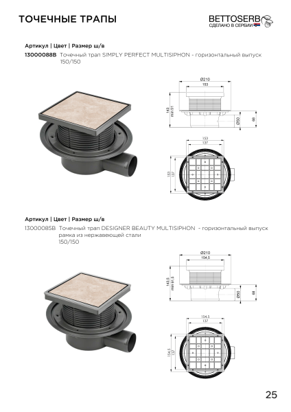 Душевой трап Трап Bettoserb 13000088B 15x15 SIMPLY PERFECT MULTISIPHON - горизонтальный выпуск