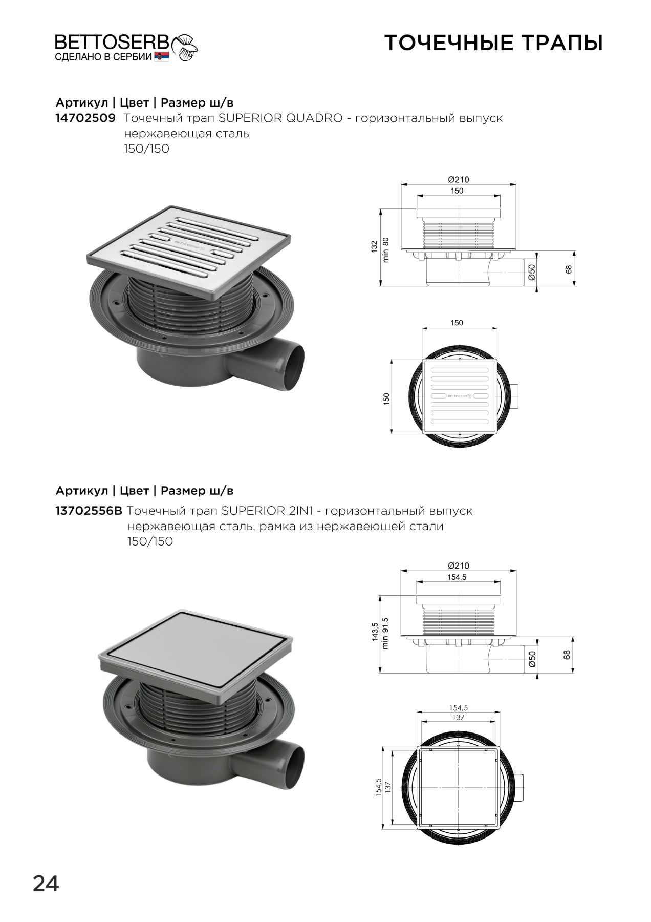 Душевой трап Трап Bettoserb 13702556B 15x15 SUPERIOR 2IN1 MULTISIPHON - горизонтальный выпуск купить