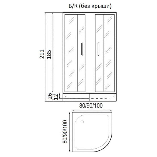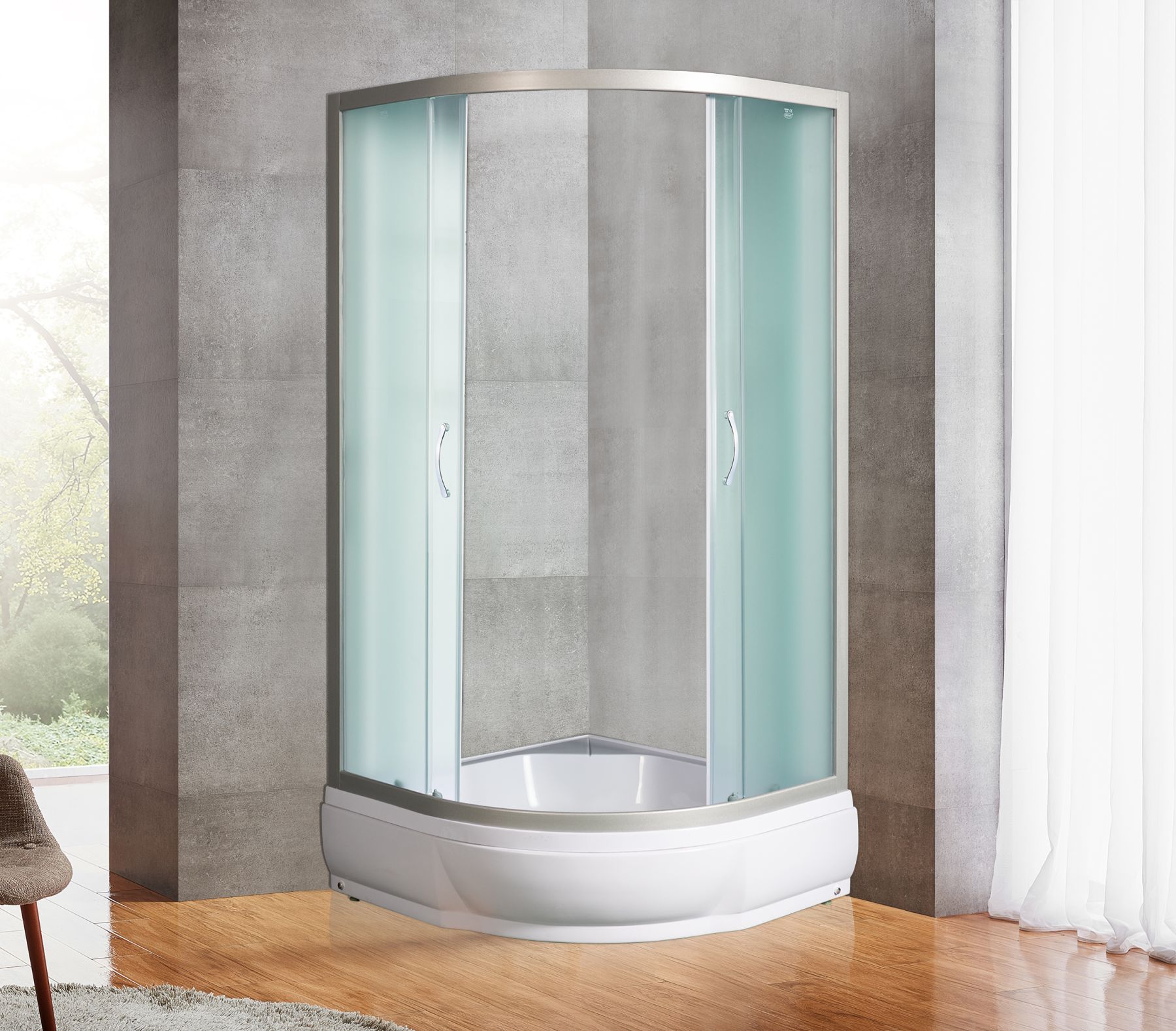 Типы и размеры:без поддона 90*90*185с поддоном 90*90*211 Матовое стекло, профиль матовый хромДушевое ограждение для ванной комнаты полукруглое с боковым регулировочным профилем и саморегулирующимися металическами, хромированными, двойными роликами.
