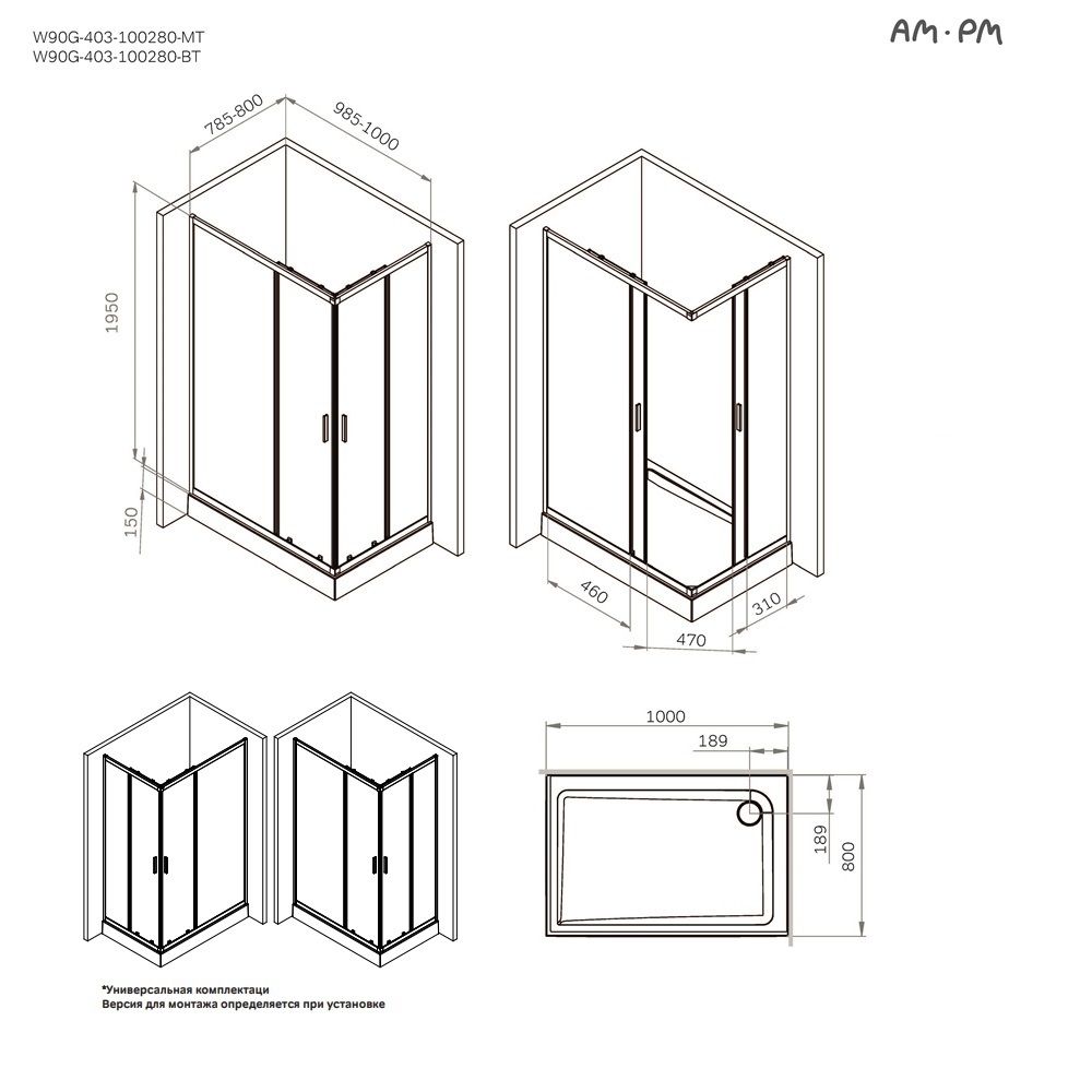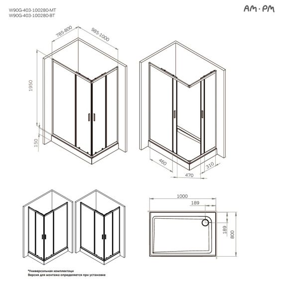 Душевой уголок Am.Pm Gem W90G-403-100280-BT 100x80 см без поддона чёрный матовый купить