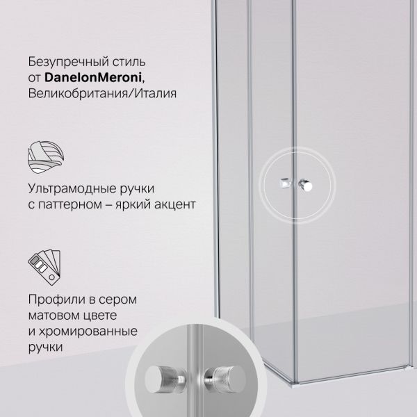 Стильное и практичное сочетание фактур: профили в сером матовом цвете и хромированные ручки предотвращают появление отпечатков пальцев рук и сохраняют поверхность чистой намного дольше. Высота профиля 1900 мм с заботой о людях высокого роста.