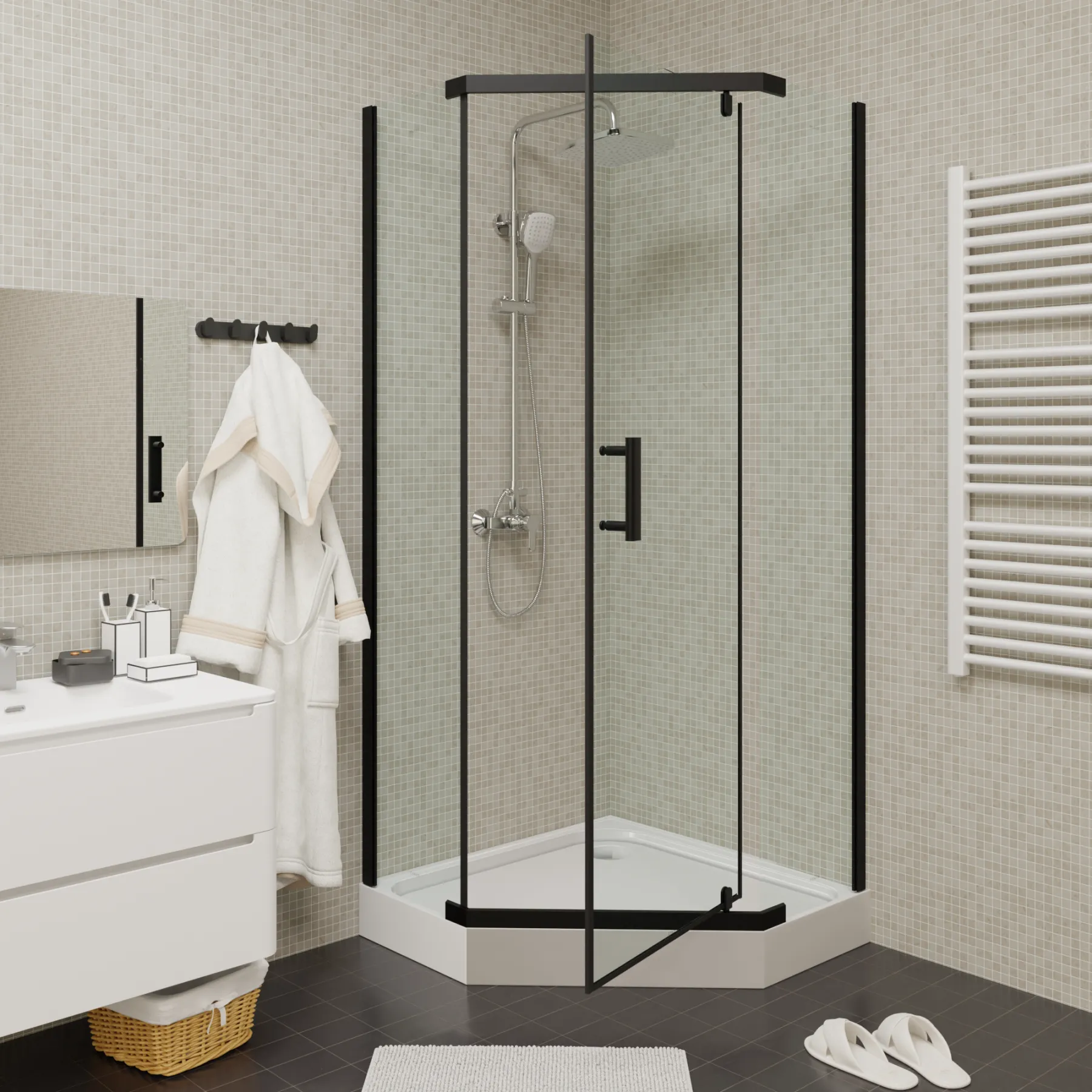 Прочная конструкция из закаленного стекла гарантирует максимально долгий срок эксплуатации душевого уголка. Поддон из ABS-пластика высотой 15 см обеспечивает комфортное использование для всех членов семьи.