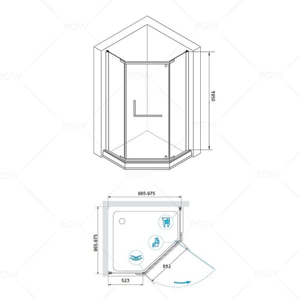 Размеры (ШхДхВ): 975x975х1950 мм.
