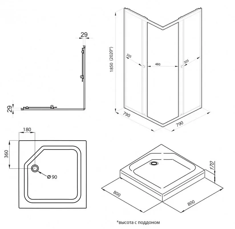 Высота с поддоном: 202 см
