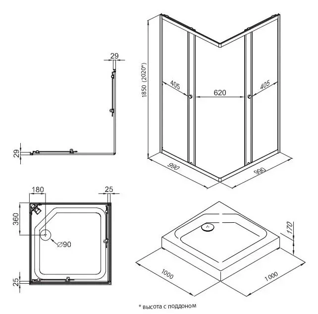 Высота с поддоном: 202 см