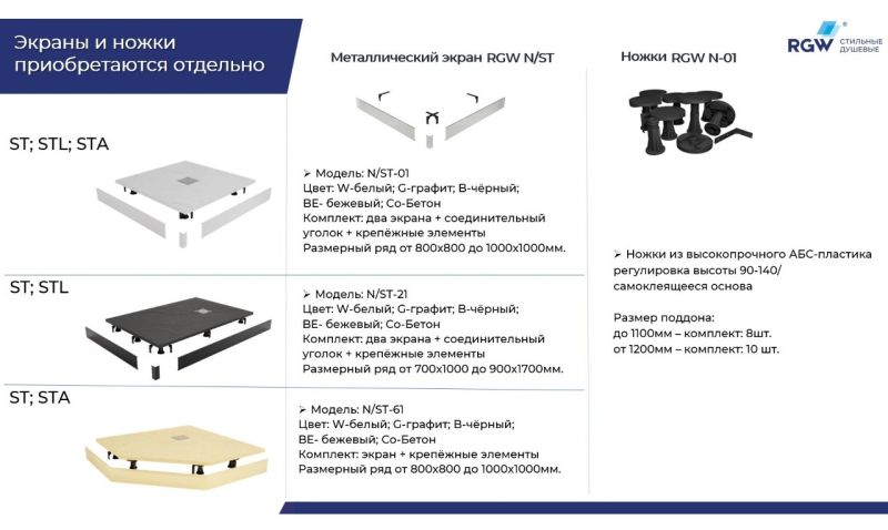 Рекомендованы ножки для поддона для установки экрана: