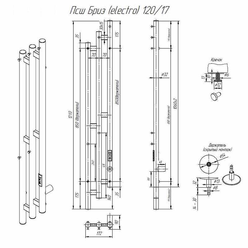 Электрический полотенцесушитель Altasan Бриз Бриз12017ЧМ Черный муар 120х17Данный полотенцесушитель имеет два вида подключения: подключение стандартным кабелем с вилкой 220 Вольт и скрытое подключение к заранее подведенной на месте установки проводке. Во втором случае необходимо обжать жилы проводки дополнительными клемниками (идут в комплекте) и подсоединить их к жилам полотенцесушителя, согласно цветовой разметки.