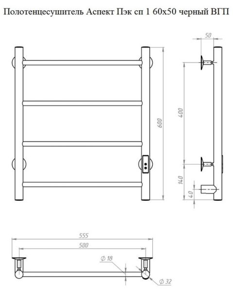 Электрический полотенцесушитель Тругор Аспект Пэк сп 1 60x50см чёрный АспектПэксп1/6050чернВГП