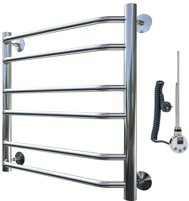 Внимание! Для скрытого монтажа электропроводки необходимо приобрести комплект скрытого подключения. Полотенцесушитель электрический комплектуется ТЭНом с терморегулятором и таймером. Изделие производится из нержавеющей стали AISI 201. Вертикальные трубы d -32 мм., для горизонтальных вставок используется труба d — 18 мм. Нагревательным элементом в полотенцесушителе является ТЭН. Полотенцесушитель заполнен бытовым антифризом.Экономичность: ТЭН нагревает антифриз до нужной температуры и выключается, далее при остывании полотенцесушителя он включается опять. Таким образом он работает не постоянно, и получается, что ТЭН потребляет электричество не 300 Вт, а порядка 100 — 150 Вт.Мощность электрического прибора порядка 100 Вт при стоимости 1 Вт — 5 руб несложно посчитать: 100Вт х 24 = 2,4 кВт в сутки. Стоимость эксплуатации изделия за сутки 2,4 кВт х 5 руб. = 12 руб. При максимальной температуре расход электричества за 30 дней составит порядка 360 руб. При условии если сушка работает круглосуточно на максимальной температуре.Удобство монтажа: Полотенцесушитель крепится к стене на четыре держателя. Изначально ТЭН не установлен в полотенцесушитель для безопасной транспортировки, его можно установить, как справа, так и слева предварительно перевернув полотенцесушитель вверх ногами и выкрутив заглушку с нужной стороны на место в которое установится ТЭН.Примечание. Внимательно изучите инструкцию по установке ТЭНа!Скрытое подключение: Для скрытого монтажа электропроводки необходимо приобрести комплект скрытого подключения.Подключение в розетку: В комплекте с ТЭНом имеется шнур с вилкой, который будет необходим при подключении к розетке.