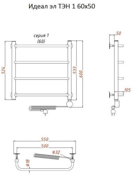 Внимание! Для скрытого монтажа электропроводки необходимо приобрести комплект скрытого подключения.Полотенцесушитель электрический комплектуется ТЭНом с терморегулятором и таймером.Изделие производится из нержавеющей стали AISI 201. Вертикальные трубы d -32 мм., для горизонтальных вставок используется труба d — 18 мм.Нагревательным элементом в полотенцесушителе является ТЭН. Полотенцесушитель заполнен бытовым антифризомЭкономичность: ТЭН нагревает антифриз до нужной температуры и выключается, далее при остывании полотенцесушителя он включается опять. Таким образом он работает не постоянно и получается, что ТЭН потребляет электричество не 300 Вт, а порядка 100 — 150 ВтМощность электрического прибора порядка 100 Вт при стоимости 1 Вт — 5 руб несложно посчитать: 100Вт х 24 = 2,4 кВт в сутки. Стоимость эксплуатации изделия за сутки 2,4 кВт х 5 руб. = 12 руб. При максимальной температуре расход электричества за 30 дней составит порядка 360 руб. При условии если сушка работает круглосуточно на максимальной температуре.Удобство монтажа: Полотенцесушитель крепится к стене на четыре держателя. Изначально ТЭН не установлен в полотенцесушитель для безопасной транспортировки, его можно установить, как справа, так и слева предварительно перевернув полотенцесушитель вверх ногами и выкрутив заглушку с нужной стороны на место в которое установится ТЭН.Примечание. Внимательно изучите инструкцию по установке ТЭНа!Скрытое подключение: Для скрытого монтажа электропроводки необходимо приобрести комплект скрытого подключения.Подключение в розетку: В комплекте с ТЭНом имеется шнур с вилкой, который будет необходим при подключении к розетке.