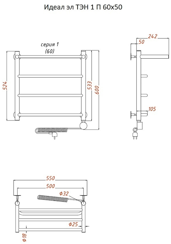 Внимание! Для скрытого монтажа электропроводки необходимо приобрести комплект скрытого подключения.Полотенцесушитель электрический комплектуется ТЭНом с терморегулятором и таймером.Изделие производится из нержавеющей стали AISI 201. Вертикальные трубы d -32 мм., для горизонтальных вставок используется труба d — 18 мм.Нагревательным элементом в полотенцесушителе является ТЭН. Полотенцесушитель заполнен бытовым антифризомЭкономичность: ТЭН нагревает антифриз до нужной температуры и выключается, далее при остывании полотенцесушителя он включается опять. Таким образом он работает не постоянно и получается, что ТЭН потребляет электричество не 300 Вт, а порядка 100 — 150 ВтМощность электрического прибора порядка 100 Вт при стоимости 1 Вт — 5 руб несложно посчитать: 100Вт х 24 = 2,4 кВт в сутки. Стоимость эксплуатации изделия за сутки 2,4 кВт х 5 руб. = 12 руб. При максимальной температуре расход электричества за 30 дней составит порядка 360 руб. При условии если сушка работает круглосуточно на максимальной температуре.Удобство монтажа: Полотенцесушитель крепится к стене на четыре держателя. Изначально ТЭН не установлен в полотенцесушитель для безопасной транспортировки, его можно установить, как справа, так и слева предварительно перевернув полотенцесушитель вверх ногами и выкрутив заглушку с нужной стороны на место в которое установится ТЭН.Примечание. Внимательно изучите инструкцию по установке ТЭНа!Скрытое подключение: Для скрытого монтажа электропроводки необходимо приобрести комплект скрытого подключения.Подключение в розетку: В комплекте с ТЭНом имеется шнур с вилкой, который будет необходим при подключении к розетке.