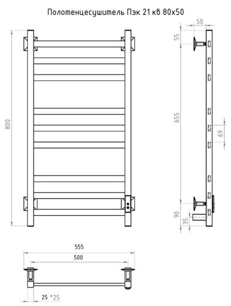 ПЭК — Полотенцесушитель электрический кабельный. Изделие производится из нержавеющей стали AISI 201. Вертикальные трубы d -32 мм., для горизонтальных вставок используется труба d — 18 мм.Нагревательным элементом в полотенцесушителе является греющий кабель — аналог «теплого пола», кабель заправляется внутрь каждой трубы и передает тепло на поверхность изделия. Во включенном состоянии постоянно поддерживается температура 50-600.Экономичность: Полотенцесушитель снабжен панелью управления. Кнопка включения/выключения и таймер на 2 часа и 4 часа, который позволяет включать изделие на ограниченное время. Эта функция дает возможность экономить электричество.Мощность электрического прибора порядка 60W при стоимости 1 кВт — 5 руб несложно посчитать: 60W х 24 = 1,5 кВт в сутки. Стоимость эксплуатации изделия за сутки 1,5 кВт х 5 руб. = 7,5 руб. Максимальный расход электричества за месяц примерно 225 руб. При условии если сушка работает круглосуточно.Удобство монтажа: Полотенцесушитель крепится к стене на четыре держателя. Универсальное исполнение изделия позволяет подключить его, как справа, так и слева.Скрытое подключение: Благодаря приваренным в нижней части вертикальных труб двум распаячным коробкам, в которых соединяется электропроводка, возможно скрытое подключение к электричеству слева и справа.Подключение в розетку: В комплекте также имеется шнур с вилкой, который будет необходим при подключении к розетке.Панель включения:РЕЖИМ №1 — постоянный нагревРЕЖИМ №2 — работа в течение 2 часов с последующим отключением.РЕЖИМ №3 — работа в течение 4 часов с последующим отключением.