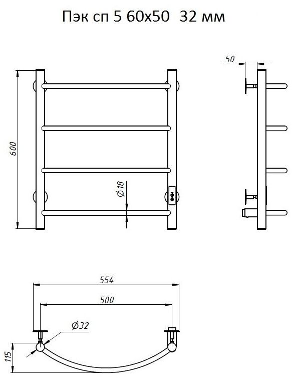 ПЭК — Полотенцесушитель электрический кабельный. Изделие производится из нержавеющей стали AISI 201. Вертикальные трубы d -32 мм., для горизонтальных вставок используется труба d — 18 мм.Нагревательным элементом в полотенцесушителе является греющий кабель — аналог «теплого пола», кабель заправляется внутрь каждой трубы и передает тепло на поверхность изделия. Во включенном состоянии постоянно поддерживается температура 50-600.Экономичность: Полотенцесушитель снабжен панелью управления. Кнопка включения/выключения и таймер на 2 часа и 4 часа, который позволяет включать изделие на ограниченное время. Эта функция дает возможность экономить электричество.Мощность электрического прибора порядка 60W при стоимости 1 кВт — 5 руб несложно посчитать: 60W х 24 = 1,5 кВт в сутки. Стоимость эксплуатации изделия за сутки 1,5 кВт х 5 руб. = 7,5 руб. Максимальный расход электричества за месяц примерно 225 руб. При условии если сушка работает круглосуточно.Удобство монтажа: Полотенцесушитель крепится к стене на четыре держателя. Универсальное исполнение изделия позволяет подключить его, как справа, так и слева.Скрытое подключение: Благодаря приваренным в нижней части вертикальных труб двум распаячным коробкам, в которых соединяется электропроводка, возможно скрытое подключение к электричеству слева и справа.Подключение в розетку: В комплекте также имеется шнур с вилкой, который будет необходим при подключении к розетке.Панель включения:РЕЖИМ №1 — постоянный нагревРЕЖИМ №2 — работа в течение 2 часов с последующим отключением.РЕЖИМ №3 — работа в течение 4 часов с последующим отключением.