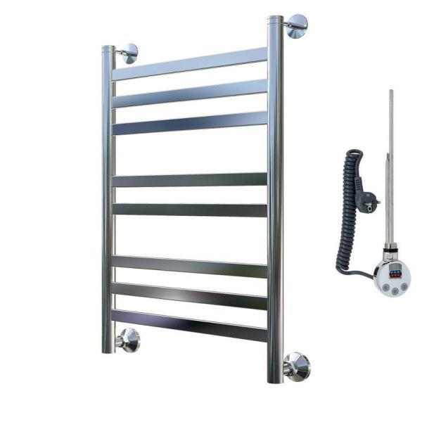 Полотенцесушитель электрический комплектуется ТЭНом с терморегулятором и таймером.Изделие производится из нержавеющей стали AISI 201. Вертикальные трубы d -32 мм., для горизонтальных вставок используется труба d — 18 мм.Нагревательным элементом в полотенцесушителе является ТЭН. Полотенцесушитель заполнен бытовым антифризомЭкономичность: ТЭН нагревает антифриз до нужной температуры и выключается, далее при остывании полотенцесушителя он включается опять. Таким образом он работает не постоянно и получается, что ТЭН потребляет электричество не 300 Вт, а порядка 100 — 150 ВтМощность электрического прибора порядка 100 Вт при стоимости 1 Вт — 5 руб несложно посчитать: 100Вт х 24 = 2,4 кВт в сутки. Стоимость эксплуатации изделия за сутки 2,4 кВт х 5 руб. = 12 руб. При максимальной температуре расход электричества за 30 дней составит порядка 360 руб. При условии если сушка работает круглосуточно на максимальной температуре.Удобство монтажа: Полотенцесушитель крепится к стене на четыре держателя. Изначально ТЭН не установлен в полотенцесушитель для безопасной транспортировки, его можно установить, как справа, так и слева предварительно перевернув полотенцесушитель вверх ногами и выкрутив заглушку с нужной стороны на место в которое установится ТЭН.Подключение в розетку: В комплекте с ТЭНом имеется шнур с вилкой, который будет необходим при подключении к розетке.