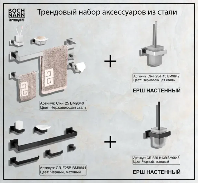 Ванная комната является одним из любимых и часто посещаемых мест человека. Мы проводим там больше 14 тысяч часов за всю жизнь, поэтому она обязательно должна быть не только уютной, но и эргономичной. Ни одна ванная комната не может обойтись без аксессуаров - незаметных на первый взгляд, но совершенно необходимых вещей, которые делают жизнь нашу намного комфортней. Они не только практичны, но и создают общую атмосферу ванной комнаты, придают ей индивидуальность и шарм.Дизайнерские аксессуары BOCH MANN стилистически завершают образ ванной комнаты, создавая целостную и продуманную концепцию. Их функциональный дизайн позволяет дополнить практически любой интерьер, а широкий ассортимент предоставляет свободу выбора. Так как срок службы аксессуаров для ванных и туалетных комнат напрямую зависит от материала, из которого они изготовлены, в производстве аксессуаров BOCH MANN используются только материалы самого высокого качества – нержавеющая сталь и закалённое стекло. Изделия из нержавеющей стали — рекордсмены по сроку службы, сохранению отличного внешнего вида и высоких эксплуатационных характеристик. Надежность конструкций аксессуаров BOCH MANN, профессиональное крепление и прочность покрытия позволяют использовать изделия не только в домашних условиях, но также и в общественных местах, включая отели и рестораны. Безупречность исполнения каждой детали, точность даже в мелочах — это признаки истинной элитарности бренда BOCH MANN. Преимущества:- эстетический внешний вид;- высококачественные материалы – нержавеющая сталь и закаленное стекло;- тип крепления – скрытый, отличающийся повышенной надёжностью;- два варианта цветов – классический черный и универсальный хром;- чёткие формы каждой детали;- качество, проверенное годами. Внимание! Производитель оставляет за собой право вносить изменения в конструкцию и комплектацию моделей без предварительного уведомления!