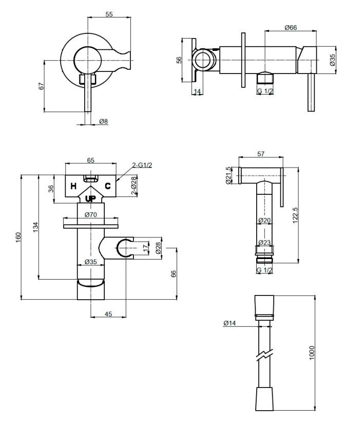 Готовый комплект гигиенического душа;скрытый монтаж;латунная лейка;шлифованное золото.